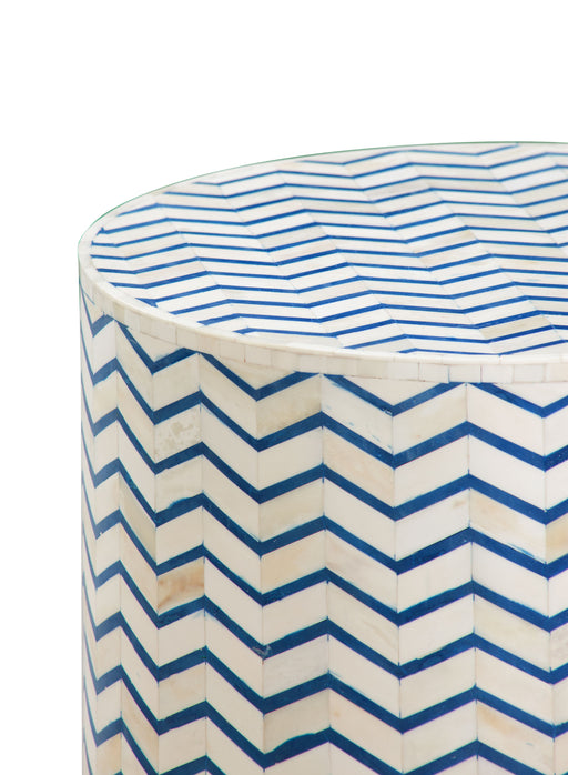 Aden Scatter Table is a round scatter table with a chevron patterning alternating natural bone and blue resin,Product Features Features art deco st...
