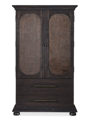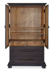 With a tactile appeal and a vintage design, the Big Sky Small Wardrobe is striking in a black Charred Timber finish over Pecky Hickory Veneers contrasting with finished burlap on the door fronts. Behind the two doors is one removable clothes rod, two adjustable shelves and four self-closing drawers. Accented by dark brushed bronze bar pulls and chic bun feet.