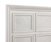 Introducing a bedroom collection that brings a breath of fresh sophistication to any living space. This suite boasts a bright, antique white finish that immediately brightens and opens up a room, providing a versatile foundation for any decor style. The bed's commanding headboard stands as a stately centerpiece, with architectural paneling details that convey a sense of sturdy elegance. Storage needs are gracefully met by the dresser and chest, each accented with refined drawer pulls that offer a subtle contrast and easy access.