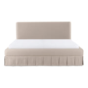 The Maren king bed exudes a soft, feminine aesthetic, upholstered in a warm, neutral fabric and featuring a playful yet refined box pleat base reminiscent of vintage finesse, straddling the line between contemporary form and traditional finish. With smoothly rounded corners and graceful, curving forms adding softness to the design, this piece is a study in elegance and subtlety.