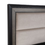 This bedroom ensemble exudes a sleek, contemporary charm with a hint of mid-century flair, perfect for creating a tranquil yet stylish retreat. The centerpiece, a bed with an upholstered headboard, is framed with a contrasting dark trim, offering a plush backdrop for rest and relaxation. Accompanying the bed are streamlined nightstands and a dresser, all featuring a rich, dark wood finish with brushed gold hardware, adding a touch of elegance and sophistication. The furniture sits on tapered legs, providing a light, lifted look that complements the modern aesthetic.
