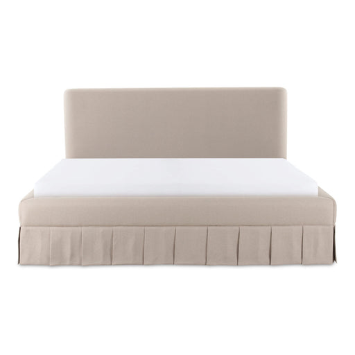 The Maren queen bed exudes a soft, feminine aesthetic, upholstered in a warm, neutral fabric and featuring a playful yet refined box pleat base rem...