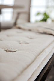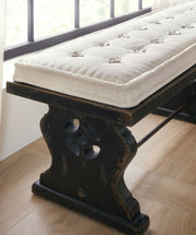 Add vintage elegance and extra seating to your dining table, the foot of your bed, your hallway or family room with this versatile Ciao Bella Bench. The unique harp-shaped legs form a beautiful base, along with a burnished brass stretcher. The exquisite black finish has multi-layered rub-through, giving the appearance it is aged gracefully through the decades. The lay-on cushion in Tuscan White is button tufted on one side with French Primitive tufting on the other side for comfort.