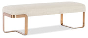 The Eleana Bed Bench combines comfort with modern elegance, showcasing a Hanalei Oat fabric seat over a plated Sunlit Bronze bent-metal base. Perfect at the foot of a bed or in an entryway, this bench adds a stylish accent and versatile seating.