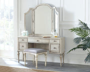 Highland Park features vintage styling in a classical bedroom collection. Sturdy construction using hardwood solids and veneers in a distressed rustic finish. Enjoy the vintage farmhouse style vanity stool with padded fabric seat.