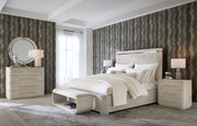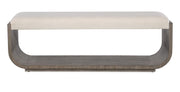 Serene, soft and stylish with a cloud-like floating appearance, the monochromatic Modern Mood Bench is upholstered in a cozy Boucle fabric and finished in the crystal-like Diamond color with wire-brush detailing. The base is crafted of Quartered Oak Veneers.