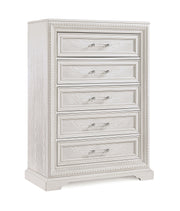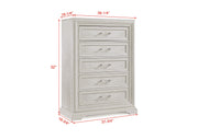 Introducing a bedroom collection that brings a breath of fresh sophistication to any living space. This suite boasts a bright, antique white finish that immediately brightens and opens up a room, providing a versatile foundation for any decor style. The bed's commanding headboard stands as a stately centerpiece, with architectural paneling details that convey a sense of sturdy elegance. Storage needs are gracefully met by the dresser and chest, each accented with refined drawer pulls that offer a subtle contrast and easy access.
