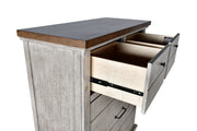Bear Creek, a rustic, farmhouse-inspired bedroom collection, features a rustic chocolate finish that contrasts beautifully with honey-stained tops and cap rails. The Bear Creek Five Drawer Chest offers spacious storage with ultra-deep drawers supported by side drawer glides for easy operation. Your purchase includes one chest.