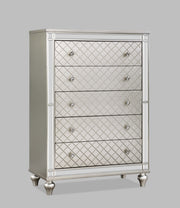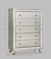 Elevate your sanctuary with this dazzling bedroom collection, where contemporary chic meets timeless charm. The suite boasts a stunning silver finish, imbuing your space with an air of sophistication and modern luxury. At the heart lies a plush, channel tufted bed that invites you to indulge in comfort, highlighted by integrated LED lighting. Ample storage solutions are provided through sleek, lined dressers and nightstands, where functionality meets finesse.