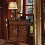 The Dresden Chest is crafted with the finest solid woods with veneers in finish. Dresden Collection is enhanced by remarkable marquetry and generously carved wood elements. The case goods feature solid hardwood with five drawers and two door with shelf for storage with coordinating carvings. The drawers feature dovetail construction and are decorated with antique brass hardware. This beautiful Dresden Bedroom Collection will add magnificence to your bedroom!