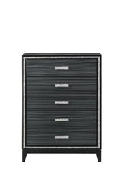 Classic design with touches of modern aspects makes this Haiden Chest ideal for any bedroom. The piece offers a rectangular table top and five storage drawers for displaying or organizing. It also features a glamorous shimmering accent trim that adds richness to design. The drawer handles carryover the same shimmering silver to tie them all together to create a cohesive look. The black finish makes it easy to fit into already existing decor.