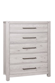 Made in the USA from solid American White Oak; this chest with five drawers; shown in an oak finish; offers a casual style to any bedroom in your home. It features a distinctive exposed tenon joint at the top and bottom.