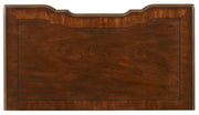 The soft shape, rich traditional finish and stylish features of the Leesburg Bachelor’s Chest will elevate the graciousness of any room. The chest has 3 drawers with the bottom drawer cedar lined, along with 2 electrical outlets and one outlet with a dimmer switch for a lamp. Crafted of Mahogany Veneers with elegant decorative cathedral and swirl mahogany veneers with light distressing. Custom-designed knob hardware has an antique brass finish.