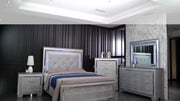 This bedroom collection offers a touch of glamour and luxury to any home. The chic silver finish paired with elegant textured panels creates a sophisticated look that can elevate any bedroom decor. The bed is a statement piece, featuring a stunning tufted headboard with integrated LED lighting that adds a classic touch to the modern design. Accompanying the bed is a selection of matching furniture pieces, including a dresser with a mirror, a tall chest, and nightstands, all finished in the same lustrous silver tone.
