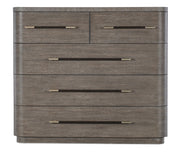 Softly sophisticated with a clean modern profile and luxe mixture of materials, the Modern Mood Bachelor’s Chest is a stunning statement piece. The case has rounded corners and a plinth base and offers five self-closing drawers. The top two drawers are felt-lined, and the bottom drawer is cedar-lined. Crafted of Oak Veneers, the nightstand is finished in the serene Diamond color and accented by metal pulls wrapped in leather.