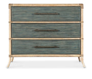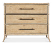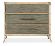 Inspired by tropical getaways, the two-tone Retreat Pole Rattan chest is a mixture of natural materials in a laid-back, versatile design. Accented by textured bar pulls in a soft pewter color. The chest is crafted of Bamboo and Maple Veneers with Rope accents. Three self-closing drawers
