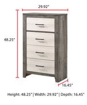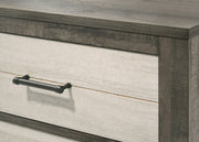 Embrace the harmonious blend of minimalist design and rustic appeal with this captivating bedroom collection. The sleek, low-profile bed is a modern take on farmhouse style, featuring a plank-style headboard with built-in lighting that adds warmth and convenience. Accompanying the bed are the clean-lined dresser and mirror, a chest, and a nightstand, all finished in a distressed wood tone that highlights the grain and character of the material. Contrasting white drawer fronts with simple, yet elegant, metal pulls add a contemporary touch, while providing ample storage space for a clutter-free environment.