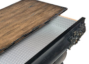 With the look of a cherished heirloom that is been passed down for generations, the Charmant Bachelorette Chest exudes an enchanting feeling that will add magic to your home. The random floral design that graces the front is carved for a dimensional feel. The Porte Noir finish is a black paint with rich brown undertones, rubbed to a medium sheen with areas of heavy rub through and distressing to reveal a honey tone wood color. Three drawers. The top drawer is lined in black and white designer wallpaper. Functional as well as pretty, the piece includes a power supply, and a light underneath with 3-intensity touch switch.