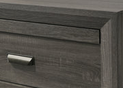 This bedroom collection encapsulates a blend of contemporary design and rustic charm. The centerpiece, a bed with a distinguished chevron patterned headboard, evokes a sense of craftsmanship and texture, infusing the space with character. Flanking the bed are matching pieces, each exhibiting clean lines and a finish that suggests a lived-in elegance. The dresser, complemented by a substantial mirror, along with the tall chest, offer ample storage solutions with understated metal handles that enhance the modern farmhouse aesthetic. A nightstand completes the set, its compact design making it a practical addition to the suite.