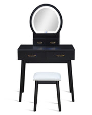 Create a chic and functional centerpiece for your bedroom or dressing area with this elegant vanity set. The sleek finish exudes modern sophistication, while the accented handles add a touch of luxury. The built-in LED-lit mirror provides optimal lighting for flawless makeup application or grooming, creating a glamorous and practical space. With spacious drawers and an upper shelf, it offers ample storage to keep your beauty essentials organized and within easy reach. The matching cushioned stool ensures comfort and style, perfectly complementing the overall design. This set combines functionality with aesthetic appeal, making it the ultimate addition to any stylish home.