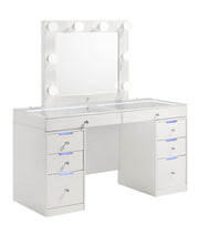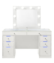 Step into a world of glamour with this sleek and chic vanity set, a perfect fusion of functionality and fashion. Its glossy finish and clean lines are complemented by the sparkle of crystal-like knobs, adding a touch of sophistication to your personal space. The spacious tabletop, graced with a large mirror surrounded by radiant lights, offers an ideal stage for beauty routines, ensuring flawless makeup application under impeccable lighting. With a variety of drawers, this vanity provides ample storage to keep essentials organized and within reach. Interior drawer lighting, integrated outlet, and hidden drawer storage are just some of the included features.