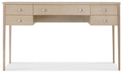 Elevate your bedroom with the sophisticated Flourish Dressing Table from the Melange collection. This transitional vanity table features the Polished Limestone finish on oak veneers and a stunning stone inset top with a natural blend of white, gray, and organic tones. With five self-closing drawers, including a concave-shaped center drawer, it offers ample storage for your essentials. The thin tapered legs add a touch of elegance, making this dressing table a perfect blend of functionality and style.