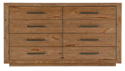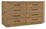 With a clean, simple silhouette, the Big Sky Eight-Drawer Dresser exudes the authenticity of the open spaces of the American wilderness. Crafted of Pecky Hickory Veneers and Cedar with a solid-wood edged top, the dresser is finished in the warm Vintage Natural. The drawers are self-closing and the top left has a removable felt liner, while the top right has a removable liner and felt jewelry tray. Both bottom drawers are cedar-lined.
