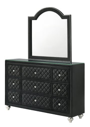 Indulge in timeless elegance and dramatic sophistication with this stunning bedroom collection, designed to make a bold statement. The centerpiece features an exquisitely tufted headboard with luxurious upholstery and intricate nailhead trim, exuding opulence and grandeur. Coordinating pieces showcase diamond-patterned tufted accents, mirrored details, and polished hardware, blending classic design with modern glamour. With ample storage and impeccable craftsmanship, this ensemble offers both style and practicality, creating a lavish retreat that embodies refined comfort and striking aesthetics. Perfect for those seeking a bedroom that radiates luxury and charm.