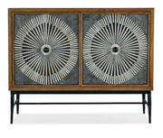 Energize your space with the exhilarating design of the Commerce & Market Chest, crafted of Mango Wood, Bone Inlay, Iron and Slate Veneer with a starburst pattern on the door fronts. The medium natural finish contrasts with a charcoal-colored metal base and slate and bone door fronts. The transparent finishes reveal color and grain variances. An artisan technique is used with the bone pieces, resulting in unique looks from piece to piece. Behind the two doors is one removable wood shelf and a ventilated back panel.
