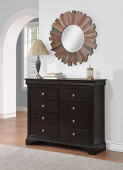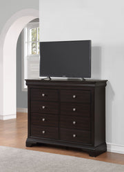 The Dominique bedroom embodies all the elegance of French design without any distracting embellishments. Clean, classic lines of Louis Philippe styling accentuate the warm merlot-stained finish of the collection. Choose from storage pieces, like the unique Chesser, that brilliantly take advantage of the vertical space in a bedroom. Design details like hidden drawers in the molding ensure stylish and functional storage for the most cherished pieces in your bedroom.