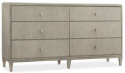 Serene with simplicity, the Elixir Six-Drawer Dresser has crisp, clean lines. Character is achieved through textural interest with the gray beige finish applied to lightly sand-blasted walnut veneer for an organic look. For added texture, the knobs are a faux shagreen. The bottom drawers are cedar lined, and there is a red drop-in felt liner in the top drawers.