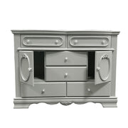 6 Drawer & 2 Doors (No Shelves Inside) Drawer: Wooden Center Drawer Glide, Dovetail Included, Felt-Lined Top Drawer, Hardware: Crystal like Knob (2 Top Drawers), Single Rossete Handle (4 Bottom Drawer) Construction Wooden Case-Frame: Bow Top Shape Wood Backet Legs Rossette Inlays Anti-Tipping KIT Included ASTM F2057 - 17 & ASTM F3096 - 14 Compliant (YES)