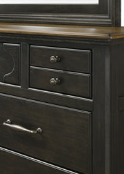 This bedroom set exudes a classic charm with a contemporary twist, highlighted by its elegant charcoal finish and stately silhouette. The centerpiece, a bed with a gracefully arched headboard, is detailed with nailhead trim, adding a touch of sophistication and textural contrast. Accompanying the bed are matching pieces, including a dresser with a mirror that reflects light and expands the space, along with a tall chest and nightstands that provide ample storage with their deep drawers and smooth metal handles.