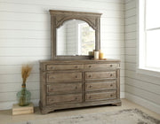 Highland Park features vintage styling in a classical bedroom collection. Sturdy construction using hardwood solids and veneers in a distressed rustic finish. The dressers eight spacious drawers offer side mounted roller bearing drawer glides for smooth open and closing. Gorgeous shaped moldings and framed drawer fronts accented by soft drawer pulls create an elegant farmhouse style for your room.