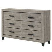 A fresh take on farmhouse design the Mari bedroom collection offers a sleek transitional design aesthetic. The bedroom set is finished in a stylish light gray with black accents that can appease anyone. The bed features a chevron-paneLED headboard and sits on black wooden legs. All the casegoods offer storage drawers with contrasting black metal pulls and sit on black wooden legs to match the bed. The dresser mirror is encased in a wooden frame to match the dresser.