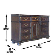 The traditional style of the Monte Carlo Dresser and mirror is highlighted by a rich cocoa finish embellished by beautiful gold tipped floral carved accents. Nine smooth gliding drawers offer metal side mounted drawer glides, dovetail drawer construction, and felt lining in the top three drawers. A spacious two-door cabinet offers an adjustable shelf for additional storage. Beautifully carved bun feet add elegance and style. Top with the gracefully arched mirror featuring a wide frame with gorgeous floral metal designs that complement the dresser.