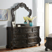 Opulent traditional styling in a Dresser with room for storage. With details that will dress up your bedroom, Rhapsody features a beautiful shaped front with fluted pilasters and scrolled legs in a multi-step molasses finish with antiqued finish rub-through that are reminiscent of fine antiques. Use alone or pair with the Rhapsody Mirror.