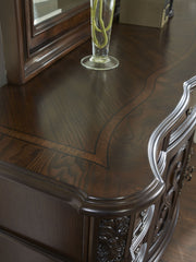 Elegant, traditional styling in a grandly scaled bedroom collection, Royale offers all the essentials of modern life in a package that honors designs from ages past. Finished in a traditional brown cherry with gorgeous burl veneers and carved accents, antique brass drawer pulls and knobs, the Royale dresser provides ample storage in its 9 drawers and spacious center cabinet with an adjustable shelf. Felt lining in the top drawers and full extension metal, side mounted drawer glides provide smooth drawer function. Top with the dramatically shaped mirror featuring beveled glass and an elegant swirling frame.