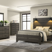 The appeal of the Thompson collection lies in the classic beauty of straight lines and the natural charm of rustic details. Replicating the look of wood grain, the dark gray laminate wraps around the entirety of each piece for a seamless and uniform finish. Two industrial-inspired reading lights are integrated into the planked headboard to illuminate your favorite book or create a cozy ambiance. Thoughtful details on the case pieces include decorative corbels arcing up at the base, dark-toned bar hardware, and fully finished drawer interiors with an attractive linen print.