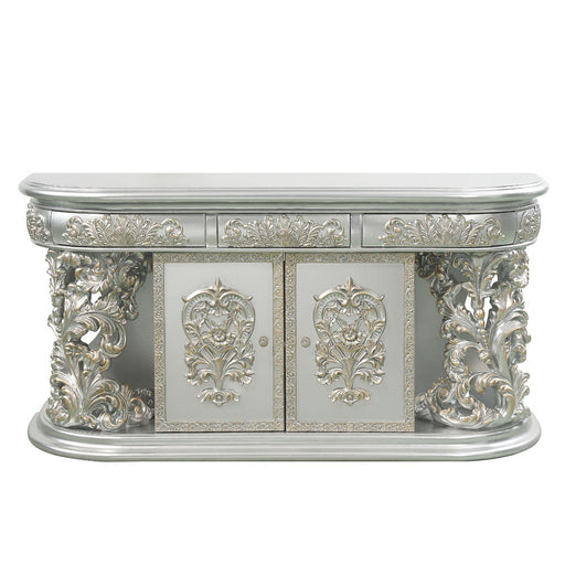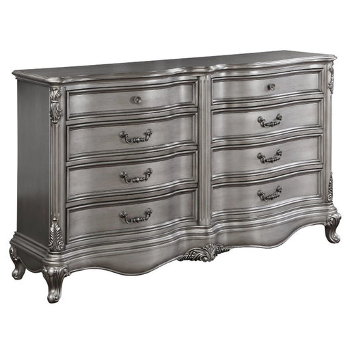 A luxurious antique silver finish with hand-brushed gold accents makes up the Sandoval dresser. Surrounded by fine Rococo scrolls and floral orname...