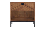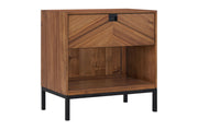 • Bring home the Astoria Nightstand to furnish your main or spare bedroom in modern, contemporary style. Showcase a bedside lamp and charge your phone up top and utilize one drawer and one shelf for storage below. Crafted from Acacia Solids and Veneers, this showstopping nightstand features a crisp chevron pattern in a Natural finish that beautifully showcases the unique characteristics of the wood grain. A Black Metal Base and Hardware complete this upscale look.