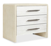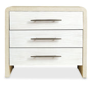 The sleek and modern Cascade 3-drawer nightstand combines the Pebble Beach lacquered burlap finish on the outside of the case with a cast resin soft white Chalk finish on the drawer fronts, accented by champagne-colored bar-pull hardware. Three self-closing drawers and a USB port and cord clip are featured.