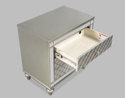 Elevate your sanctuary with this dazzling bedroom collection, where contemporary chic meets timeless charm. The suite boasts a stunning silver finish, imbuing your space with an air of sophistication and modern luxury. At the heart lies a plush, channel tufted bed that invites you to indulge in comfort, highlighted by integrated LED lighting. Ample storage solutions are provided through sleek, lined dressers and nightstands, where functionality meets finesse.