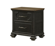 This bedroom set exudes a classic charm with a contemporary twist, highlighted by its elegant charcoal finish and stately silhouette. The centerpiece, a bed with a gracefully arched headboard, is detailed with nailhead trim, adding a touch of sophistication and textural contrast. Accompanying the bed are matching pieces, including a dresser with a mirror that reflects light and expands the space, along with a tall chest and nightstands that provide ample storage with their deep drawers and smooth metal handles.