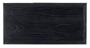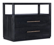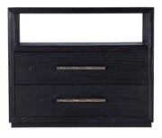 With the aura of a rustic mountain cottage, the Linville Falls Two-Drawer Nightstand has an airy feel with an open area at the top and two self-closing drawers. Crafted of Pine Veneers, the nightstand is finished in Shadow, a charred black finish achieved through Shou Sugi Ban, a Japanese technique that creates a look resembling burnt wood. Textured metal bar pulls in an antique pewter finish add an organic accent. Functional features include a double USB charging port and a cord clip on the back.
