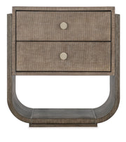 Symmetrical, monochromatic and timeless with a luxe mixture of materials, the Modern Mood Two-Drawer Nightstand is a statement piece. The case is crafted of Oak Veneers in a wire-brushed dark Mink finish, the drawer fronts and top are wrapped in raffia and trimmed in metal with warm brushed-nickel knobs. Drawers are smoothly-operating and self-closing.