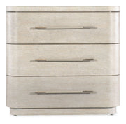 Softly sophisticated with a clean modern profile and luxe mixture of materials, the Modern Mood Nightstand is a stunning statement piece. The case has rounded corners and a plinth base and offers three self-closing drawers. Crafted of Oak Veneers, the nightstand is finished in the serene Diamond color and accented by metal pulls wrapped in leather.