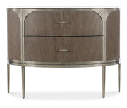 Architectural and timeless with a luxe mixture of materials, the Modern Mood Nightstand is a statement piece. Featuring a demilune shape and two self-closing drawers, the nightstand has a metal frame, legs and slender pulls and a white and gray marble top. The case is crafted of Oak Veneers and finished in the dark Mink color with wire-brush detailing.