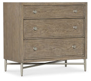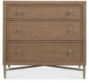 A stylistically versatile nightstand blending natural textures with a light-and-airy modern aesthetic, the Sonnet Nightstand has 3 self-closing drawers and a metal base, stretcher and tapered legs. Crafted of Quartered and Cathedral-Cut White Oak Veneers in a light earthen-toned finish, the nightstand has a cord clip on the back and satin-finished champagne-colored knobs.