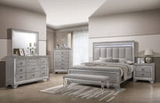 This elegant bedroom suite combines timeless design with contemporary appeal. The soft gray finish offers a modern twist on classic styling, with integrated LED lighting on the tufted headboard adding a luxurious focal point. The collection includes a bed, nightstands, a dresser, and a mirror, all featuring refined detailing and silver-toned hardware that exudes sophistication. Each piece showcases a distinct wood grain pattern, enhancing the suite's upscale charm. The dresser and nightstand provide generous storage, with smooth-gliding drawers that cater to a seamless organization.